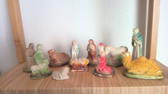 This is my Nativity Scene. It was purchased in November, or December, of 1946 by my parents, probably from Woolworths for less than $10. It is the Nativity Scene I have had all my life. As you can see a wise man has gone for a walk, some sheep have wandered off, two camels got tired of waiting for their riders and the angel looks like she was mucking out the cow’s stall. While this cheap, plaster of Paris set, which is chipped and dusty has no monetary value, at 74 years of age it is priceless to me.